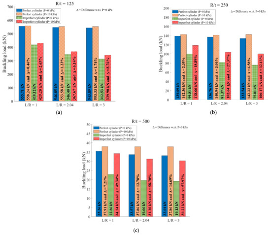 Figure 12 shows a summary of the global buckling loads with and without the internal pressure, shown in Figure 6, Figure 7, Figure 8, Figure 9, Figure 10 and Figure 11. For a specified R/t ratio, the global buckling loads with and without the geometric initial imperfection decrease as the L/R ratio increases (i.e., the length (L) of the cylinder increases, while the radius (R) of the cylinder is fixed) for the cylinders with and without the internal pressure. Furthermore, the reduction in the (Ncr)imperfect for L/R = 2.04 and 3 compared with the result for L/R = 1 is greater than that of the perfect cylinder for both cases with and without the internal pressure. As shown in Figure 12, the internal pressure improves the global buckling loads for both cases with and without the geometric initial imperfection. In addition, compared with the global buckling load with the axial compressive force only, the increase in the global buckling load due to the internal pressure is clearly observed for the larger L/R ratio or R/t ratio. For the perfect cylinders, the thinnest and longest model (R/t = 500 and L/R = 3) shows the highest increase in the global buckling load (14.69%), and the lowest increase of 0.46% is observed for the thickest and shortest model (R/t = 125 and L/R = 1) compared with the results without the internal pressure. However, for the geometrically imperfect cylinders with the internal pressure, the global buckling load increases by 57.97% for the thinnest and longest model (R/t = 500 and L/R = 3) and by 2.65% for the thickest and shortest model (R/t = 125 and L/R = 1) compared with the global buckling loads without the internal pressure. The highest increase in the (Ncr)imperfect due to the internal pressure is not observed for the thinnest and longest model (R/t = 500 and L/R = 3) but is observed for the cylinder with R/t = 500 and L/R = 2.04. Nevertheless, the difference in the increase in the global buckling load (Ncr)imperfect due to the internal pressure between the two cylinder models (L/R = 2.04 and 3 with R/t = 500) is less than 1%. This difference may be caused by the numerical error because a nonlinear analysis is conducted using the iterative method with different Q values in this study. Therefore, for the cylinders with R/t = 500, it can be considered that the change in the global buckling load due to the internal pressure is almost identical for cases with L/R = 2.04 and 3. Consequently, it is concluded that the effect of the internal pressure on the thin-walled composite cylinder with or without the initial imperfection is greater for cylinders with higher R/t and L/R ratios. In addition, the increase in (Ncr)imperfect because the internal pressure is higher than that in (Ncr)perfect. For example, for the model with R/t = 500 and L/R = 2.04, the (Ncr)perfect with an internal pressure (P) of 10 kPa is 37.86 kN, which is a 12.78% increase compared with the result considering only the compressive force. The (Ncr)imperfect with an internal pressure (P) of 10 kPa is 31.20 kN, which is 58.70% higher compared with the result considering only compression. The increase in (Ncr)imperfect due to internal pressure is more than about four times higher than that in (Ncr)perfect. As one can see, the internal pressure of the thin-walled composite cylinder reduces the effect of the geometric initial imperfection.