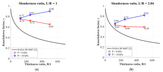 Figure 13 shows the derived buckling knockdown factors of the thin-walled composite cylinders using the previous results for global buckling loads. The red circles represent the knockdown factors considering only the axial compressive forces. The blue triangles represent the buckling knockdown factors with both axial compressive forces and internal pressure.