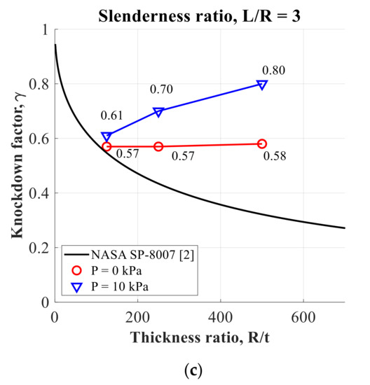 First, the knockdown factors derived in this study and NASA’s results [2] are compared. For both cases with and without the internal pressure, the difference in the buckling knockdown factors between this study and NASA’s result [2] increases as the cylinder’s thickness become thinner for a specified L/R ratio. This is because NASA’s design criteria [2] are based on buckling tests from the 1930s to 1960s; therefore, state-of-the-art manufacturing processes and advanced materials for modern thin-walled cylinders are not included, and the geometric initial imperfection becomes more severe when the thickness of the cylinder decreases (i.e., thinner cylinders). Similarly, as the L/R ratio decreases with and without the internal pressure, the difference in the buckling knockdown factors between this study and NASA’s buckling criteria [2] increases for the given R/t ratio. It is observed that NASA’s buckling criteria [2] are overly conservative for cylinders with lower L/R ratios because they assumed that the effect of the length of the cylinder on the buckling knockdown factors is negligible [37], although the length of the cylinder affects the buckling behavior of the thin-walled cylinder.