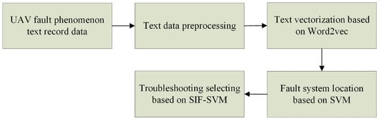 Compared with structured numerical data, UAV fault phenomenon text data belong to unstructured data. Text data are unstructured and cannot be directly used to establish a mathematical model for calculation, and the text records of different fields and business objects vary widely. To use the text data of UAV fault phenomenon to select a troubleshooting mode, the text data were preprocessed first, including text word segmentation, the removal of “stop words”, etc. Second, the preprocessed text data were vectorized to obtain the text vector data of UAV fault phenomenon. Third, SVM model was trained by using fault phenomenon text vector data, and the fault locations were determined. Fourth, SIF-SVM was used to fuse the information of the fault location and the fault phenomenon, and the troubleshooting mode was selected. The preprocessing and modeling process of text recording data of UAV fault phenomenon is shown in Figure 1.