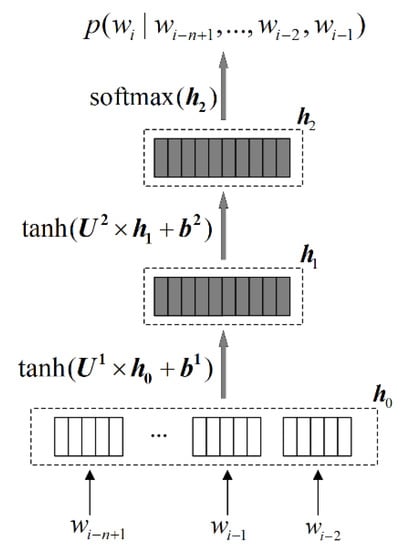 Therefore, we only need to model to get the representation of the th word. To solve this problem, Bengio et al. [22] proposed a language model based on a feedforward neural network. Its premise was that each word is mapped to a low dimensional continuous real vector, and the probability of p in an n-gram model is modeled in the continuous vector space. For a three-layer feedforward neural network (Figure 2), the first words are mapped into word vectors and spliced into :