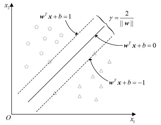 As can be seen from Figure 4, the equal sign of the above formula was established according to the several sample points closest to the hyperplane that did not belong to the same class. These sample points are called support vectors, and the sum of the distances between the two support vectors that do not belong to the same class and the hyperplane is called the interval, which can be expressed as: