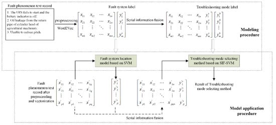 Based on the UAV fault record text data, the UAV fault location model and troubleshooting mode selection model were established. In the modeling, the text description of fault phenomenon was preprocessed, and feature extraction was carried out. Using the text feature data and fault location label, the fault location model was then established via the SVM. Next, the serial information fusion method was used to fuse the fault phenomenon text feature data with the fault location labels, and, thus, the troubleshooting mode selection model was established by using the troubleshooting mode labels and the SVM. In the application of the model, through the fault location model, the fault location was determined by using the text feature data from the fault phenomenon. Once the fault location and fault phenomenon text were fused, the fused data were used to select the troubleshooting mode through the troubleshooting mode selection model. The modeling procedure and model application procedure are shown in Figure 5.