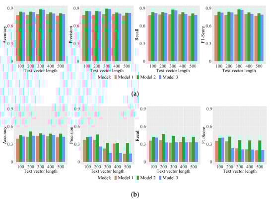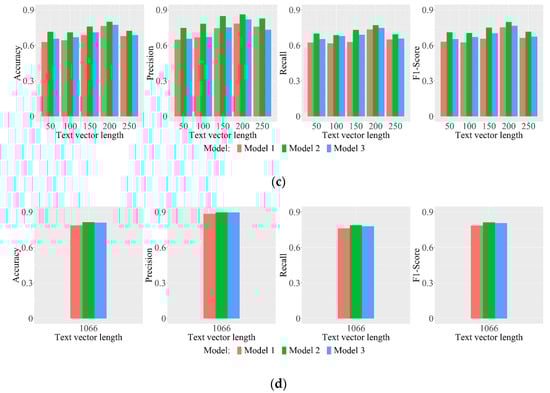 The text features extracted by Word2Vec were effective for modeling, as can be seen from Figure 6a. In different text vector dimensions, accuracy, precision, and recall of Model 3 achieved more than 80%. When the text vector dimension was 300, the modeling effect was the best: the accuracy was 0.8733, the precision was 0.8831, and the recall was 0.8633. As shown in Figure 6b, the text features extracted by Doc2Vec were poor for modeling. The essence of LDA was subject extraction of the text, so the text vector length was set to 50, 100, 150, 200, and 250. As can be seen from Figure 6c, when the text vector length was 200, the effect of Model 3 was the best, and the accuracy, precision, and recall were 0.7738, 0.8198, and 0.7480, respectively. TF-IDF extracted text features through the importance of words in the corpus, so the length of the text vector was generally the number of words contained in the corpus. The model based on the text features of TF-IDF was effective. The accuracy, precision, and recall of Model 3 were 0.8100, 0.8971, and 0.7798, respectively.