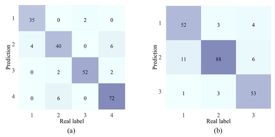 In the actual UAV maintenance scenario (i.e., the scenario used in Model 3), the proposed troubleshooting mode selection process was a two-stage model. Within this framework, we acquired the fault location, and then selected the troubleshooting mode. As shown in Table 9, in the fault location stage, the model accuracy, precision, and recall reached 0.9005, 0.8994, and 0.8984, respectively. It showed that the fault location model could accurately locate the fault location of the UAV. In the troubleshooting mode selection stage, the model could also accurately determine the fault handling mode. The confusion matrix of the model results of the two stages is shown in Figure 7.