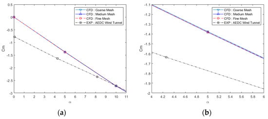 To determine the dependence of the result regardless of the mesh density, the mesh dependence study test is undertaken with three types of mesh density: coarse, medium, and fine. The test is undertaken for steady angle of attack sweep analysis from 0, 5, and 10 deg angle of attack. The test was undertaken with the same flow setting as in Table 2 and the longitudinal moment coefficient (CM) is compared with the wind tunnel result.