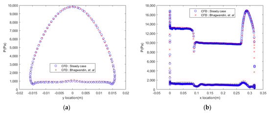 Static pressure (P) profile of (a) circumferential pressure at c.g.; (b) Axial pressure from nose to base along with the symmetry plane cut.