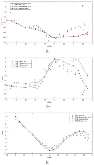 Figure 14a shows the comparison of () vs. α graph for the unsteady analysis. The CFD result shows good agreement with the wind tunnel data for low angle of attack cases, while the difference between these two becomes more significant for higher angle of attack cases. The area for angle of attack above 20 deg is considered as high angle of attack area whereas unsteady and non-linear flow phenomenon occurs. The divergence of results along with the increasing angle of attack is bound to happen. Although there is a bigger difference at higher angle of attack, the CFD result has a greater tendency to follow the previous numerical analysis result by Bhagwandin, et al. [10]. Meanwhile, there are quite a few discrepancies between the results at Figure 14b because the for unsteady analysis was calculated using the AR matrix form [21] of the Equation (7) with fewer points for the CFD analysis than the wind tunnel test points. Lastly, for , results from pitching mode are overlapping between the unsteady and the steady analysis as shown in Figure 14c.