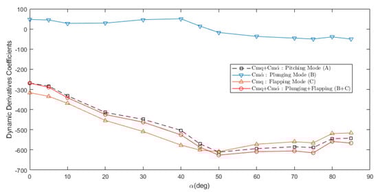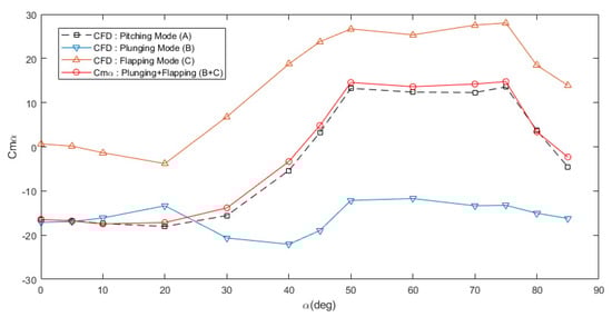 The results of dynamic derivatives for moment coefficient due to change in angle of attack are shown in Figure 17 and Table 4. The summation of of plunging mode (B) and flapping mode (C) equals from the pitching mode (A).