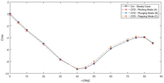In Figure 15, the static steady case Cm shows a linear gradient between the three points. Meanwhile, for the unsteady pitching mode analysis, there are hysteresis loops that show there are some dynamic effects from the pitching motion. The pitching movement adds another moment force due to the change of alpha , alpha change rate , and pitch rate . Due to these changes, the missile faces an additional or less “actual” angle of attack for the same alpha depending on which direction it is oscillating (Figure 1). Hence, there are different values of Cm for the same alpha value. Meanwhile, the static cases are facing the same “actual” alpha with the given alpha test points. Figure 15 also shows the difference hysteresis loops between pitching and flapping modes. The flapping mode has a similar hysteresis loop with pitching modes, but with lower hysteresis points due to the superposition of simple harmonic oscillation between pitching movement and the heaving movement which counter the change in alpha due to alpha change rate , leaving only Cm change due to pitch rate .