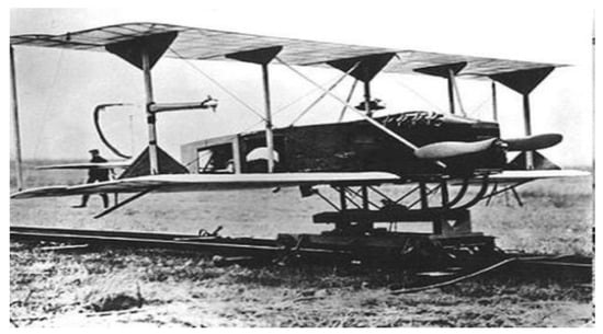 Initally, UAVs were mainly used for military applications such as reconnaissance, surveillance, and weapon delivery. Before the first manned airplane flight, primitive UAV technology was used in military applications such as combat and surveillance in at least two wars [7]. In 1917, Dr. Peter Cooper and Elmer A. Sperry invented the automatic gyroscopic stabilizer, which helped the aircraft to fly straight and maintain the flight level. Their technology has been used to convert a U.S. Navy Curtiss N-9 trainer into the first radio-controlled UAV, as shown in Figure 1. It was a pilotless biplane made out of wood [8]. The Sperry Aerial Torpedo flew 50 mi carrying a 300 lbs bomb in several tests.