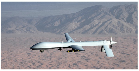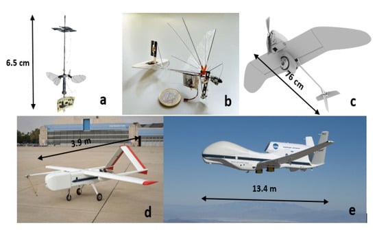 - “Large UAVs” are used to provide long endurance flights for surveillance and carry weapons to desired areas with a length greater than 10 m. An example is Global Hawk, with a length of 13.4 m and a wingspan of 35.35 m, shown in Figure 2e [20].