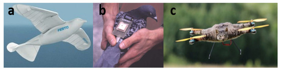 Unconventional UAVs: (a) flapping wing [60], (b) live bio UAV [61], (c) taxidermy bio UAV [62].