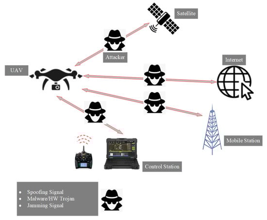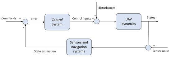 Unmanned aerial vehicles (UAVs) have become increasingly important in different disciplines of civilian and military applications due to their improved endurance and stability in several conditions and operations [1]. According to the Association for Unmanned Vehicle Systems International (AUVSI), there were more than 2900 UAVs across more than 900 companies providing services around the world in 2020 [2]. A UAV can be described as a pilotless aircraft that can fly and stay airborne without a human operator onboard, able to perform critical operations without risking a human’s safety, and operating more cost effectively than equivalent manned systems [3]. They can be either remotely piloted, whereby the control actions are performed from a ground control station using a remote control, or operated autonomously, whereby the UAV is capable of performing the control actions onboard using autopilot and various sensors, including IMUs and GPS [4,5]. They can perform a variety of functions, including remote sensing, transportation, armed attacks, and search and rescue missions. UAVs can be referred to using different terms, such as drones, remotely piloted aircraft (RPA), unmanned aerial systems (UASs), and remotely piloted aerial systems (RPASs). These various terms are often due to the different criteria and requirements of military and civilian systems. Usually, in some studies from the Department of Defense (DoD), they are referred to as UASs, while the term “drone” is quite popular in the media and commercial companies [6]. In this study, we refer to these systems as UAVs.