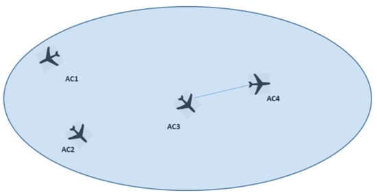 Figure 1 shows an arbitrary sector. The only interdependency exists between and . However, as there are four aircraft in the sector, the potential number of interdependencies is six, therefore the ED score for this sector is .