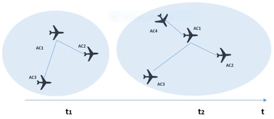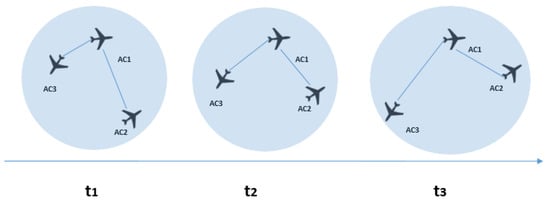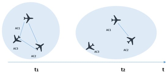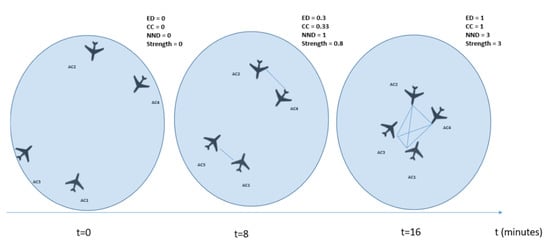 The clustering coefficient indicator is illustrated in Figure 3. In , the three aircraft form a cluster. Such a configuration of aircraft represents a situation where they are tightly connected. It can be observed that is moving away from the two other aircraft, thus breaking the cluster. In the first timestep, the controller would need to be concerned with all of the aircraft present in the sector, while in the second timestep, an interdependency exists only between and . This illustration shows how only measuring the strength is not enough to give a rich picture of complexity, but different topological characteristics need to be examined.