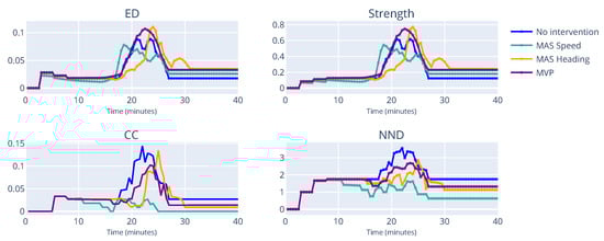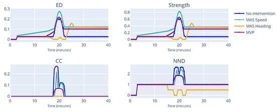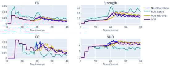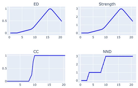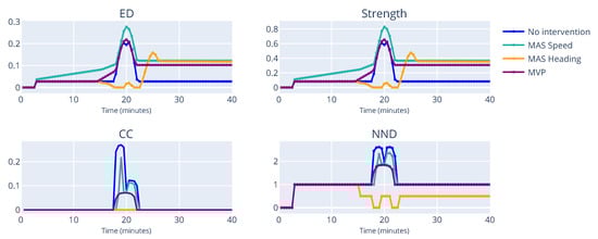 Figure 8 shows the evolution of indicator in the simulation time. For the first 3 min, the scores are all zero, as the aircraft have not yet started creating interdependencies amongst them. The first interdependencies are created between and . In this example, there was no intervention to separate the aircraft, therefore the peak for ED and Strength is reached around the 15 min mark, where all aircraft are in conflict with each other, as demonstrated by the ED value of 1, which is the theoretical maximum. Interestingly, the peak values of CC and NND are reached around the 10 min mark. Such a result indicates that all aircraft now have interdependencies with each other, shown by the value of NND being 3. This example illustrates how complex scenarios can occur even before the start of conflicts, as evidenced by the peak of CC and NND happening before the peak of ED and Strength.
