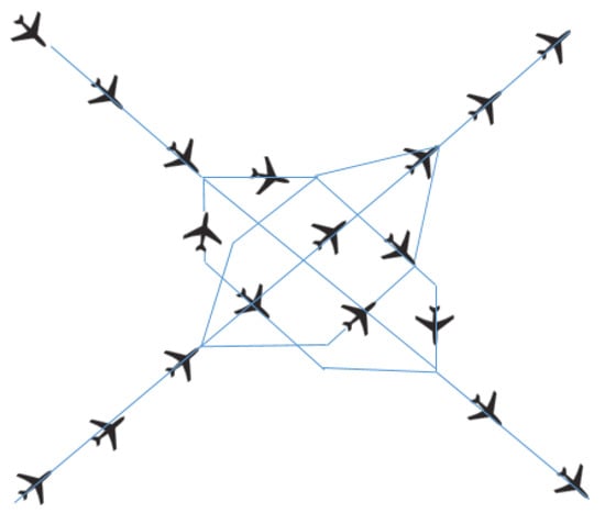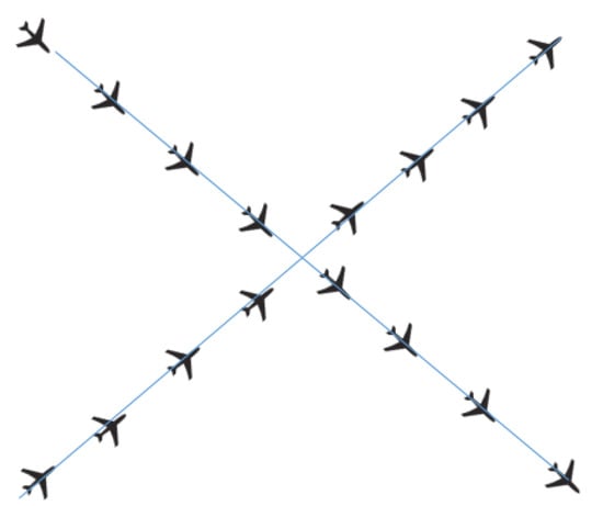 A realistic example is the intersection of two Miles-in-Trail (MiT) flows. This way of traffic organisation is well accepted among controllers to reduce air traffic complexity. In MiT, traffic is structured into flows of aircraft following the same path. Flights in the same path are separated by a certain distance and their speed is regulated. These flows create queues of aircraft that are easier to manage by controllers []. In this section, we show different conflict scenarios and how they would be solved by different CR algorithms and we will illustrate how the values of each complexity indicator evolve during that time.