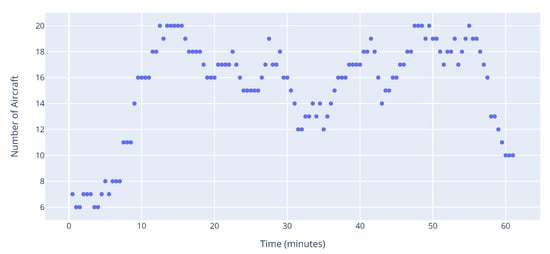 The most common metric from the first group is Aircraft Density [,], defined as the number of aircraft at the time of measurement. Another common metric is Dynamic Density (DD) [,,]. There are several ways DD has been defined in the literature, but the underlying core idea is to define complexity as the weighted sum of several attributes. Examples of such attributes include the number of aircraft, number of cruising, ascending and descending aircraft, speed, heading change, number and time to conflicts, etc. Interval Complexity [], is similar to DD but is calculated as the average over a 5–10 min window. However, they do not give an evolution of complexity in time.