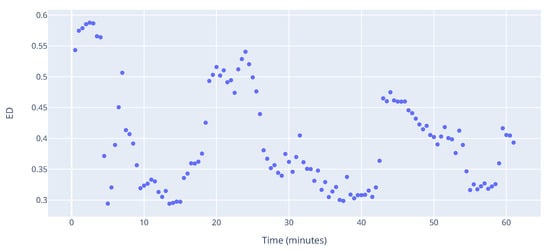 In Figure 16, ED of the hour of operations is shown. The ED score is relatively low, with the highest being around 0.6, which occurs when the number of aircraft is around 8. This means that the majority of aircraft do not get close enough to each other to be considered interdependent. Such a result further confirms initial statement, that the number of aircraft does not present a full picture of complexity.
