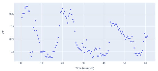 Figure 17 shows the clustering coefficient throughout the hour. The overall distribution is similar to that of ED, which suggests that there is an area in the sector where aircraft tend to cluster. Nevertheless, one can see that such clusters do not last long (in this case around 5 min).