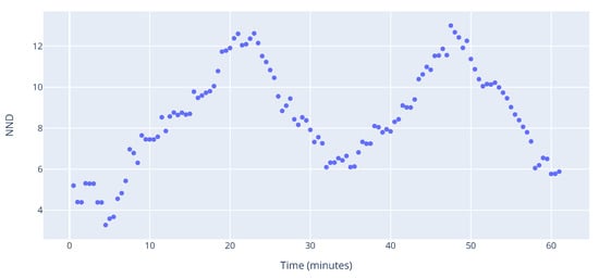 The NND score, shown in Figure 18, provides similar information. There is a peak around the 20 and 50 min marks, which corresponds to a peak in the other indicators as well as the number of aircraft. However, in the beginning, when the CC and ED score quite high, NND is at its lowest. This is due to a small graph size, which is further supported by a small number of aircraft. Between the two peaks, a steady decline and increase of NND is observed. Such a behaviour is evidence of the shape of the graph during that time, meaning that even though clusters are not formed, interdependencies are not just pairwise, but span multiple aircraft. This shows that relatively complex situations can arise even when the graph is small (as evidenced by ED), with a group of aircraft needing special attention.
