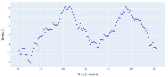 The strength indicator for the hour of operations is visualized in Figure 19. Similarly to the rest of the indicators, there are peaks around the 20 and 50 min marks. However, the shape of the distribution is akin to that of NND, which supports our claim in the previous paragraph about the nature of interdependencies. On top of that, the similarity between NND and strength further suggests that in this particular case, not only do interdependencies span multiple aircraft, they are also quite strong, which adds to the complexity of the situation.