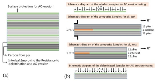AO can penetrate through cracks, resulting in damage to the interior material [11]. For composite laminates, cracks are most likely to occur in the resin-rich interlaminar region during the molding process and application. However, there is no research on improving the AO resistance of the interlaminar region, and no work has studied the AO erosion behavior of the delamination surface of the composites.