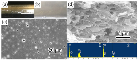 The PEK-C films were transparent because they were formed by homogeneous PEK-C without micro-phase separation (Figure 2a). Different from the PEK-C films, the PS100 films were milky white and not transparent, indicating that PSPPP and PEK-C are not completely compatible, and micro-phase separation occurred during the film formation process (Figure 2b). SEM images of the PS100 show that many small dark dots are distributed on the film surface and many micropores with small particles on the fracture surface. The size of the micropores is around 2–7 μm, whereas the particle size is relatively smaller (Figure 2c,d). The above results indicate that micro-phase separation occurred during film formation, and the interface of the two phases is very poor. Compared with the results of energy dispersive X-ray spectroscopy (EDS), it can be considered that the continuous phase is a blend of PEK-C and PSPPP, while the particles are mainly PSPPP.
