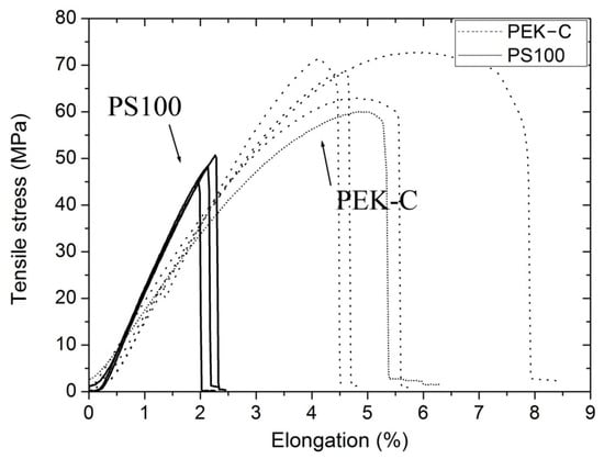 Figure 4 gives the tensile curves of the PEK-C film and the PS100 film. The PEK-C film is significantly higher than the PS100 film in both tensile strength and elongation at break. The elongation at break of the PEK-C film reaches 5.5%, showing obvious stress-plastic yield, whereas the elongation at break of PS100 film is only 2.2%, showing brittle fracture. It indicates that the toughness of the PS100 film is significantly lower than that of the PEK-C film because of the brittleness of PSPPP.