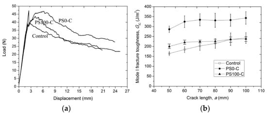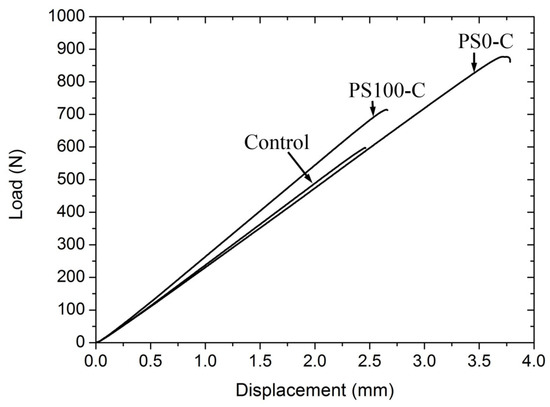 The typical load–displacement curves of ENF tests are given in Figure 6. The load increases linearly with the increase in displacement at the beginning stage for all three samples. When near the critical load, plastic deformation occurs, and the increase in load become nonlinear. It can be seen that for the PS0-C specimen, the plastic deformation is most obvious. The plastic deformation of the PS100-C specimen is significantly smaller, but it is still larger than the control specimen.