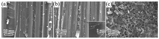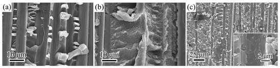 Figure 8 presents the SEM images of the delaminated surfaces of the three samples after the mode II test. The mode II delamination usually occurs at the interlayer because of the tensile crack and the fiber/resin interface because of the transverse shear stress. For the control sample, a hackle structure is found, which is the typical interlayer cohesive failure for a brittle matrix [28]. For the PEK-C-toughened PS0-C sample, the fracture surface is relatively rough. Ductile deformation and nano-sized phase separation of the resin can be clearly seen. After being toughened, the toughness of the interlayer is significantly increased and the tensile cracks inside it do not occur easily. The main failure mode is changed to interfacial bonding failure. Due to the high viscoelastic energy dissipation of ductile interlayer, GIIC is greatly improved. For the PS100 film-toughened PS100-C sample, an obvious resin phase-separation structure and carbon fiber/resin interfacial debonding can be seen. The morphology of carbon fiber is missing in certain parts of the CF interface. It indicates that the phase separation leads to interface deterioration. In addition, the toughness of the PS100 interleaf is also lower than PEK-C, resulting in lower GIIC. However, it is still higher than the control sample.