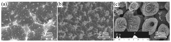 The morphologies of the 6421 resin, PEK-C film, and PS100 film after AO erosion are shown in Figure 9. The surface morphologies of the 6421 resin and PEK-C film after erosion are relatively similar. Both surfaces became uneven surfaces, which is a typical AO-eroded surface morphology of homogeneous materials. On the other hand, for the AO-eroded surface of the PS100 film, numerous quasi spheres containing nano-sized pores are found. The diameter of the spheres is around 5–8 μm. Comparing the element composition of the eroded film with the unirradiated film, the carbon content is much lower, while the relative proportions of phosphorus and oxygen are much higher. This is because PS100 displays phase separation of PEK-C and PSPPP. The AO erosion rates of these two polymers are significantly different. After erosion, the PEK-C phase near the film surface was removed, whereas the PSPPP phase was oxidized into phosphate compounds and prevented the further diffusion and erosion of AO. Thus, the PS100 film has a lower AO erosion rate and special eroded morphology.