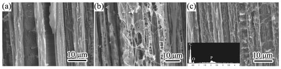 The mode I delamination surface of PS100-C after AO erosion is quite different. Compared with the un-eroded surface shown in Figure 7c, the interlayer resin was partly eroded, and the shape of carbon fibers appeared. However, all the carbon fibers are covered with a layer of compounds with high phosphate content, and nearly no eroded carbon fiber is found. This indicated the eroded interlayer plays a role in self-healing for AO erosion and protects the carbon fiber and matrix.