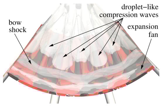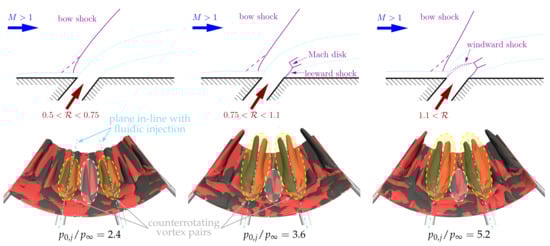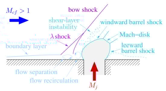 A wide range of engineering applications capitalises on the benefits of fluidic injection into supersonic crossflows, e.g., flame-holding [], thrust vectoring [], supersonic air-breathing engines, and noise suppression [,]. The shock wave pattern associated with such high-speed applications has been described experimentally [,,,,], and numerically using steady-state RANS calculations [] and Large Eddy Simulations (LES) [,,]. Multiple jets in crossflow have been used in gas turbine combustors [] and shock wave translation [,].