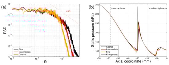 The smallest flow scales, i.e., shock wave thickness or smallest turbulent length scales, are lower than a mesh resolution with efficient use of computational resources could handle. Thus, the governing equations are spatially filtered, and the Favre-averaging of the equation set is performed. The arising subgrid-scale terms account for unresolved physics. The nature of the smallest flow scales is to dissipate the kinetic energy into heat at the molecular level. This effect needs to be endorsed employing some model since insufficient dissipation would promote an unphysical energy build up []. Smagorinsky [] introduced an artificial viscosity model, similar to the eddy viscosity concept, acting as a subgrid-scale model to stabilise the numerical approach. Calibration coefficients are required, which can affect the flow-field substantially, e.g., shown by Uzun et al. [], and need to be obtained empirically. Despite the recent development of novel subgrid-scale models [,,], the compressible nature of nozzle flow challenges the choice of an adequate explicit subgrid-scale model. At a distance from solid walls, the dissipation is dominated by the kinetic energy transfer from the large to the small flow scales. This behaviour is statistically universal at sufficiently high Reynolds number accordingly to Kolmogorov’s hypothesis, which is promising for modelling. In the present approach, the subgrid scales are represented implicitly by the intrinsic numerical dissipation of the solver. The approach is also known as monotonically integrated Large Eddy Simulation or implicit LES. For a non-oscillatory finite volume discretisation of at least second-order accuracy, the numerical truncation error can be interpreted as a Clark-type subgrid-scale model for the momentum equation and as a Smagorinsky-type subgrid-scale model for the energy conservation Equation []. Hence, the kinetic energy fluctuations are absolutely decreasing with this approach and no spurious energy build-up at the high frequencies occurs, which is proven by the spectra shown in Figure 3a. The entire discretisation resolution of the mesh grid is exploited, and no information is truncated by an explicit filter [,]. Further, no calibration constants are required, which might be difficult to obtain for internal supersonic nozzle flows.