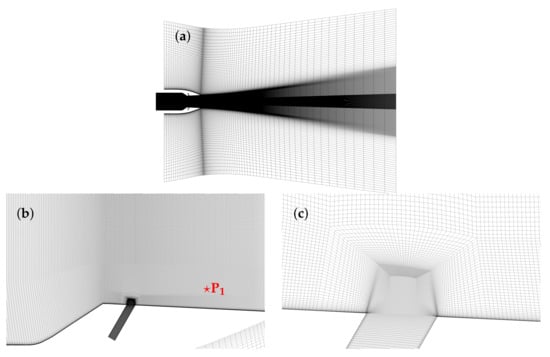 The numerical grid is shown in a mid-plane view; entire computational domain (a), zoomed view of the investigation section (b), and detailed view at the interface between a jet pipe and nozzle surface (c).