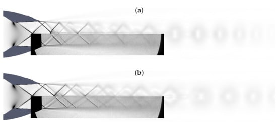 The experimental visualisation of confined supersonic flow is challenging. Instead, the numerical simulation data are compared to measurements of the external shock pattern performed at the University of Cincinnati []. Figure 5 reveals that the numerical approach captures (on a coarser mesh resolution than the intermediate mesh) accurately the shock wave angles and locations, which are the focus of the present investigation. More quantitative validation with particle image velocimetry data has been documented by Semlitsch et al. [] for external fluidic injection, where a good agreement regarding the streamwise velocity magnitudes and shock wave angles and locations are reported.