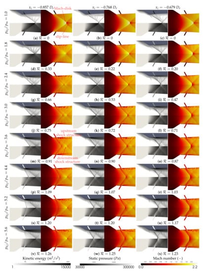 Three injection locations , i.e., , , and upstream from the nozzle exit, are considered to investigate the sensitivity of the shock pattern on the injection location found beneficial by Semlitsch & Mihăescu []. The injector diameter is of mm. The injector total temperature is set to the ambient temperature, and the flow is aligned with the pipe axis. The injector total pressure is an investigation parameter referred to as Injection Pressure Ratio (IPR), relating the applied total pressure at the injector inlet to the ambient pressure.
