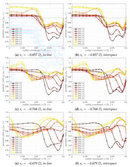 Effect of injection pressure and location: radial time-averaged static pressure profiles (normalised by the ambient pressure) are shown at the nozzle exit, in-line with injection (in-line: (a,c,e)) and in between the injection (interspace: (b,d,f)), respectively.