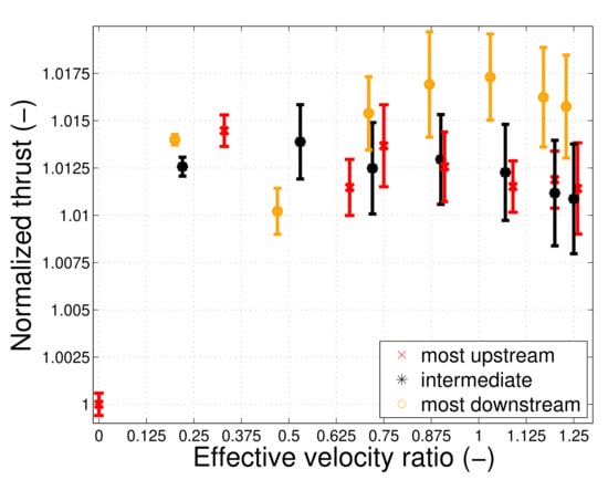Fluidics can be potentially used to compensate for the under-expansion of an exhausting jet and match the static with the ambient pressure at the nozzle exit. The profiles of the time-averaged static pressures shown in Figure 9 exhibit significant radial variations at the nozzle exit, which can be attributed to the shock waves and injected wakes penetrating this plane. Without fluidic injection, the static pressure is high in the interior flow while being significantly lower at the outer circumference. Figure 9 demonstrates that injection augments the static pressure successively at the circumference, where the injection location affects its impact. Significant differences between the wake and in between wake profiles can only be noted for the most downstream injection location. Hence, the injected flow is not the principal contributor to the static pressure rise at the circumference. Moreover, the downstream shift of the second, downstream shock pattern towards the nozzle exit is the cause. The best pressure match (uniform around the circumference) is achieved for injection pressure ratios of approximately for the intermediate injection location.