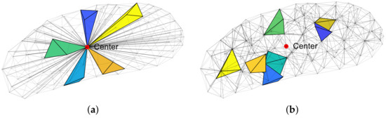 31]; that is, there are no other points in the circumscribed ball of each tetrahedron, except for its own four vertices. A significant advantage of the Delaunay algorithm is that it can make the minimum angle of each tetrahedron element in the mesh system constituted by a given point set as large as possible, allowing us to obtain tetrahedron elements with as high a quality as possible.