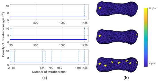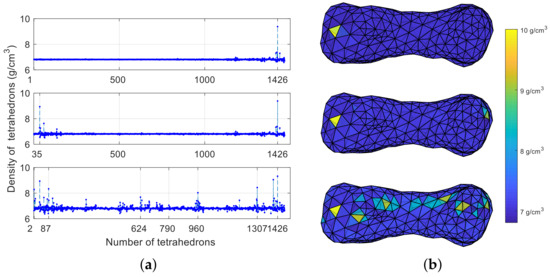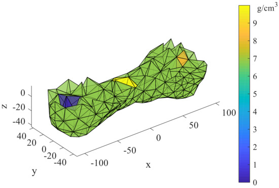 Figure 4b shows the location of the three density mutation cases in each tetrahedral model, and different densities correspond to different colors. To display the result better, the tetrahedrons with density mutations selected in this study are on the surface of the asteroid. The tetrahedrons with single and double mutations are distributed at both ends of the asteroid, and the ten mutations are evenly distributed. For example, tetrahedrons No. 2/35/1401 and No. 1426 are at the ends, and tetrahedrons No. 624/790/960 are near the center of the asteroid.