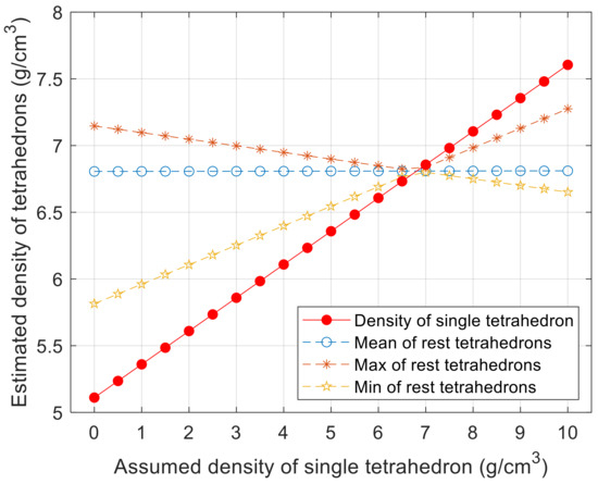 Figure 5 shows the estimated density of tetrahedron No. 1426 and the minimum, maximum, and mean of the other 1466 tetrahedrons as a function of the assumed density of that tetrahedron. The red solid line with the red points is the estimated density of tetrahedron No. 1426, and the blue dotted line with the blue circle is the mean value of the remaining tetrahedrons. The yellow and magenta dotted lines with symbols of the yellow star and the magenta asterisk show the minimum and maximum values of the remaining tetrahedrons, respectively.