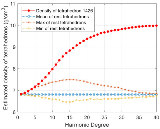 and calculated the correction for these initial values under the three density mutation assumptions cases. The density estimation results of the mutations and the other tetrahedrons as a function of the harmonic degree used for the “true” gravity field are shown in