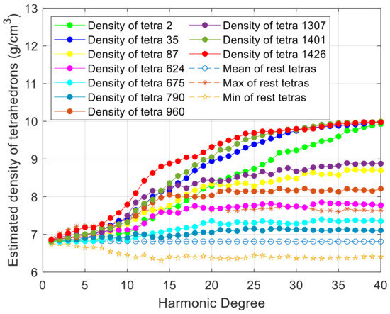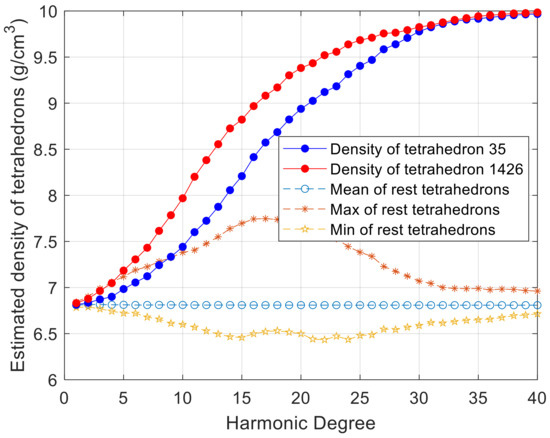 Figure 4, it can be found that, when the least-squares method is applied, the density of the mutational tetrahedron can be well estimated. However, we can also see that the densities of the surrounding tetrahedrons will be significantly affected by the mutant tetrahedron, while the tetrahedrons far away from this mutant tetrahedron are almost unaffected. The maximum density of the remaining tetrahedrons is bigger than tetrahedron No. 35 when the harmonic degree is less than 10, as shown in