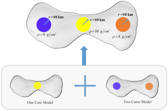 Figure 10. Assuming sphere structures with a radius of 10 km at the center and both ends of the target asteroid, the density near the center of mass is