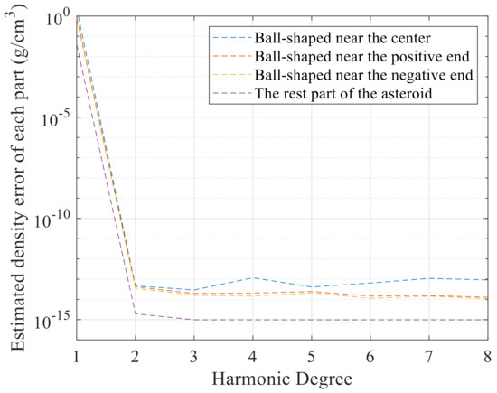 Figure 12 (different colors correspond to different density values). Therefore, as long as the true spherical harmonic coefficients are obtained during the exploration, the density distribution of the asteroid with a known structure can be effectively estimated.
