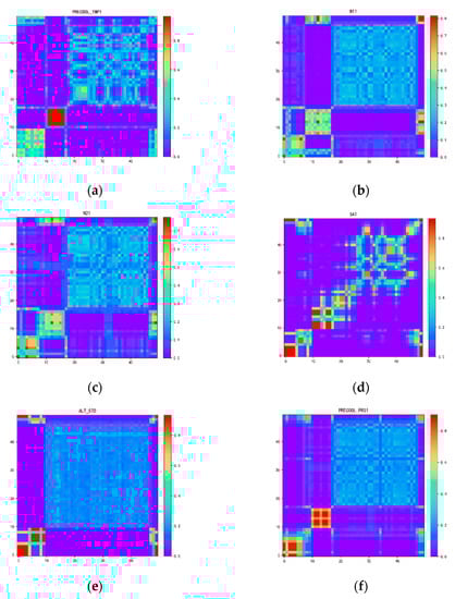Results of Markov Transition Field Analysis: (a) Markov Transition Field analysis of Precool_TMP1; (b) Markov Transition Field analysis of N11; (c) Markov Transition Field analysis of N21; (d) Markov Transition Field analysis of SAT; (e) Markov Transition Field analysis of ALT_STD; (f) Markov Transition Field analysis of PRS1.