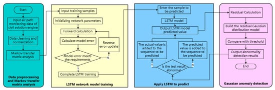 In the formula, represents the anomaly detection results of the i sample; ε represents threshold. The appropriate critical value is the key to ensure that the Gaussian model can accurately identify abnormal samples. The selection of the critical value is determined by the three-sigma rule [24]. The anomaly detection process based on LSTM and Gaussian model is shown in Figure 9.